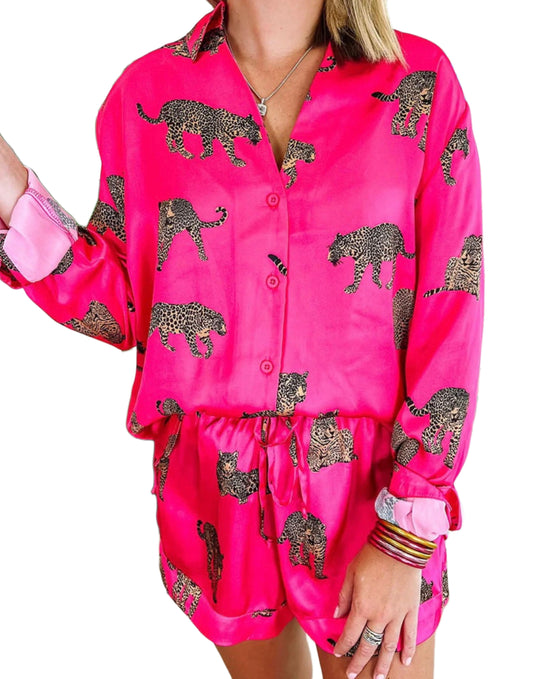 Strawberry Pink Cheetah Print Satin Lounge + Pajama Set