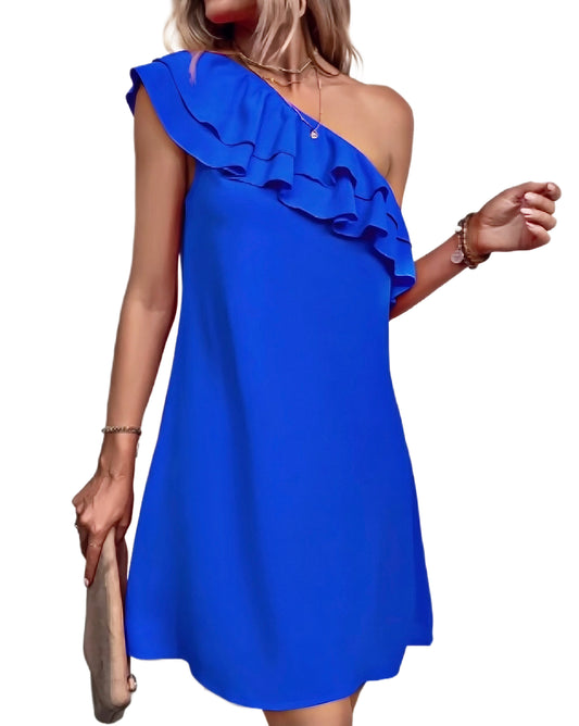 Ruffled One-Shoulder Dress in Cobalt Blue