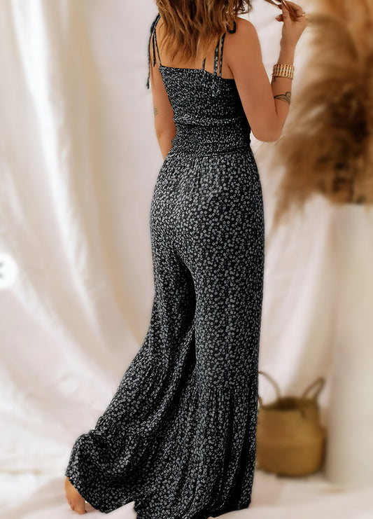 Gypsy Smocked Wide Leg Black Floral Jumpsuit